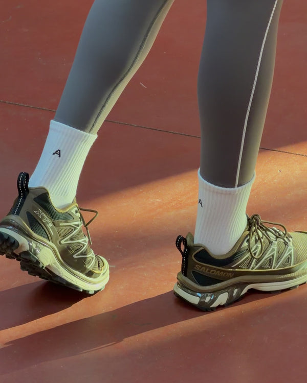 The Initial Crew Socks feature a timeless ribbed knit and a plush, breathable feel. These classic white socks perfectly bridge the gap between high-performance activewear and everyday streetwear. Accented with our minimalist "A" initial, they provide a secure, mid-calf fit that grounds your energy - whether you're crushing a studio or gym session, or stepping out in your favorite sneakers.