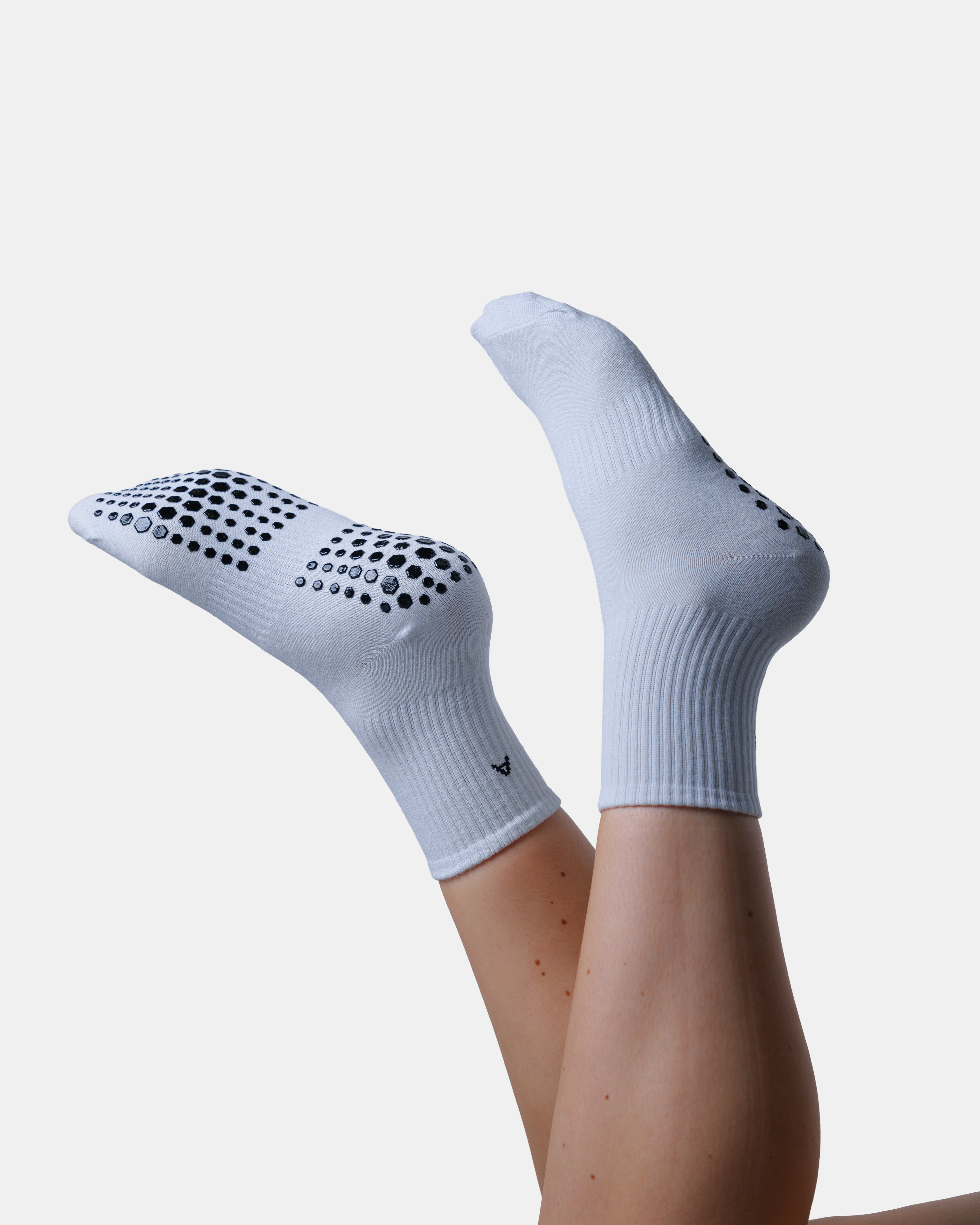 The Initial Grip Socks are designed with a classic ribbed crew fit and an advanced hexagonal traction pattern on the sole. These socks provide the ultimate anchor for your movements. They deliver a flawless blend of barefoot-like freedom and unshakeable stability, empowering you to hold deeper poses and pulse with precise intention - whether you are dominating a pilates class, perfecting your barre technique, or mastering your flow at home.